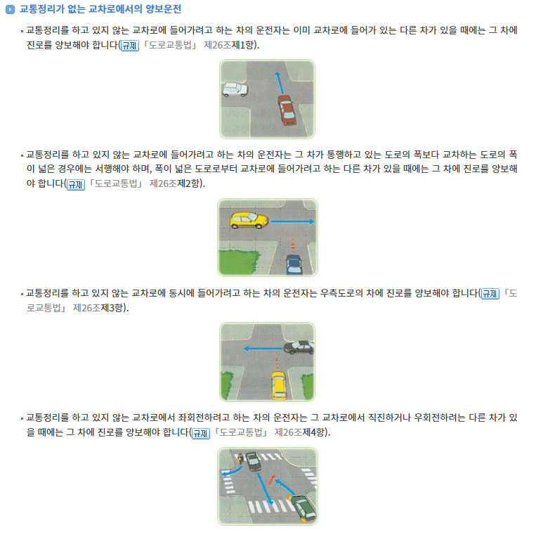 교차로에서의 진로 양보는 매우 중요합니다. 교통정리가 없는 교차로에서 다음과 같은 상황에서는 반드시 다른 차량에게 양보해야 합니다.