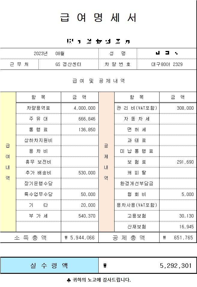 대구 GS25편의점 배송 지입차 급여명세서