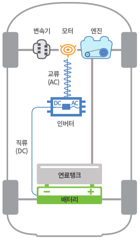 - 인버터(Inverter): 전기모터에서 생산된 교류를 직류로 변환시켜 배터리에 저장을 하고, 전기모터를 구동할 때는 배터리에 저장된 직류를 역으로 교류로 변환시켜 전기모터에 공급하는 장치이다.